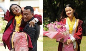“Akhirnya Jian Ayune Sundul Langit (lulus) dengan predikat pujian,” katanya, disambut dengan tepuk tangan para undangan yang hadir.