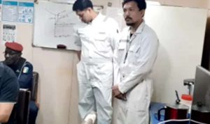 Terlihat orang di atas perahu membawa sebuah jerigen (galon), diduga meminta bahan bakar dengan dalih akan sandar di sisi kapal Tugboat yang sedang berlayar.