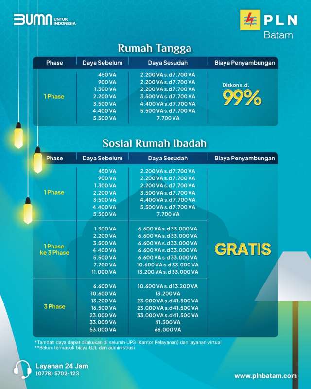 “Untuk mendapatkan promo ini, pelanggan hanya perlu berkunjung ke Kantor Unit Pelaksana Pelayanan Pelanggan (UP3) yang terletak di Batam Center, Nagoya, Batu Aji, atau Tiban dengan membawa identitas diri dan bukti rekening pembayaran terakhir. Bisa juga menghubungi Contact Center PLN Batam di (0778) 5702 123, Pelayanan Virtual PLN Batam, atau media sosial PLN Batam. Petugas kami akan memberikan informasi dan membantu prosesnya dengan senang hati,” pungkas Khairullah. (**)