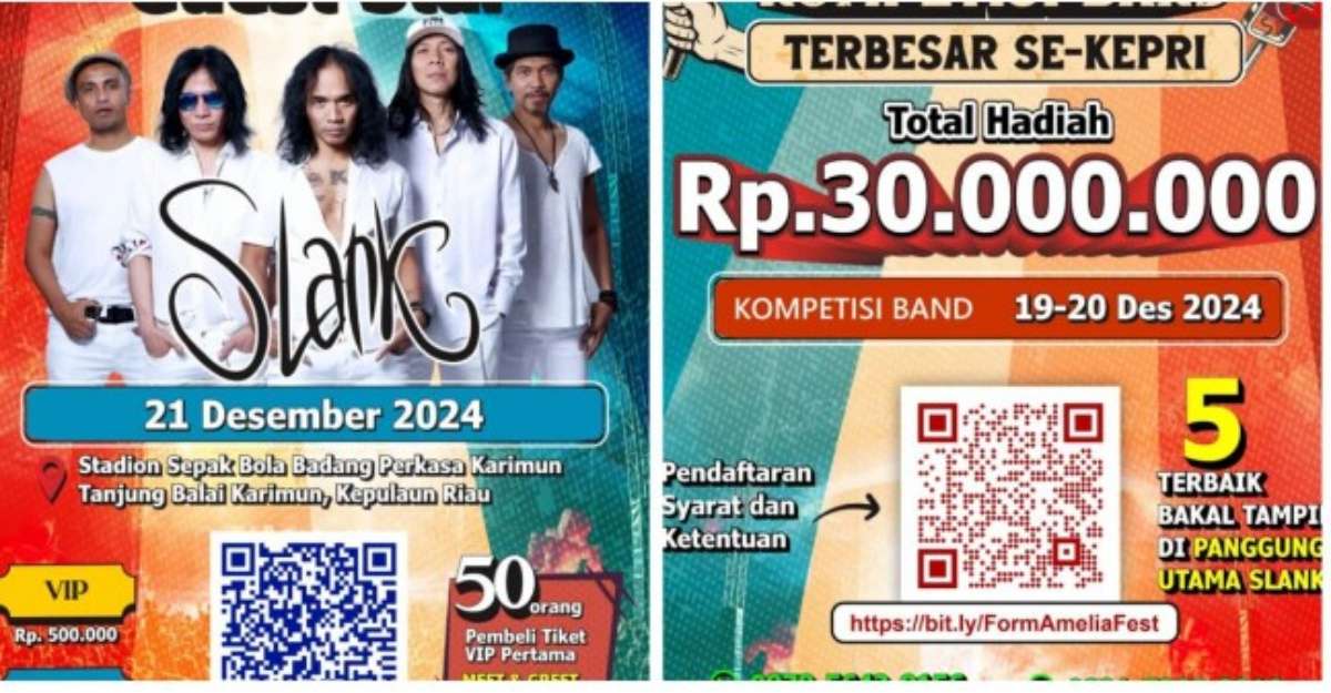 TimesAsiaNews.com | Karimun, Kepulauan Riau – Grup band papan atas asal Indonesia, Slank, bakal konser di Kabupaten Karimun, Kepulauan Riau (Kepri), penjualan tiket guest star itu pun sudah dibuka. Slank dijadwal akan tampil di Amelia Fest 2024 di Stadiom Badang Perkasa, Tajung Balai Karimun (TBK), pada tanggal 21 Desember 2024 mendatang.