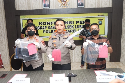 TIMESASIANews.com | Batam – Polresta Barelang – Kapolsek Lubuk Baja Kompol Budi Hartono,SIK,M.M. menggelar Konferensi Pers Ungkap Pelaku Pembunuhan Berencana yang di damping oleh Kasihumas Polresta Barelang AKP Tigor Sidabariba, SH serta Kanit Reskrim Polsek Lubuk Baja Iptu Thetio Nardiyanto, SH. Bertempat di Mapolsek Lubuk Baja. Kamis (29/12/2022)