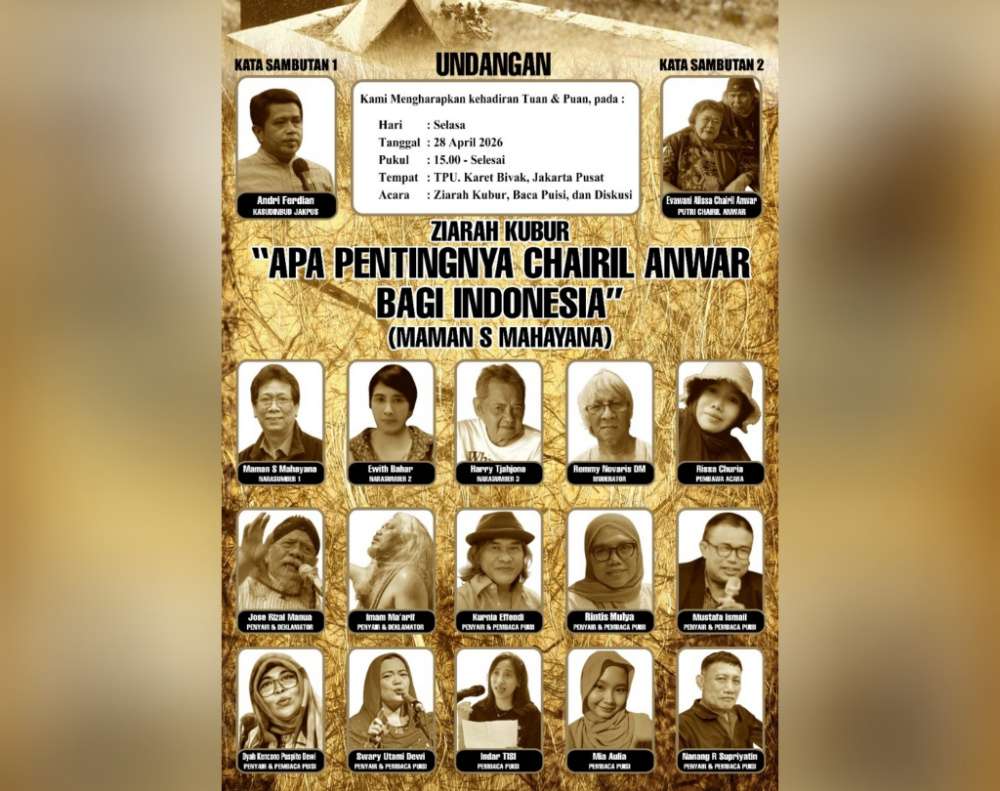 TimesAsiaNews.com | Jakarta – Untuk memperingati wafatnya Penyair dan Pujangga Besar Chairil Anwar -sebagai pelopor sastra Angkatan ’45- Komunitas Sastra TISI (Taman Inspirasi Sastra Indonesia) kembali akan mengadakan ziarah kubur, diskusi dan baca puisi ke Makam Chairil Anwar di TPU Karet Bivak, Jakarta Pusat. Selasa (28/4/2026), mulai pukul 15.00 WIB.