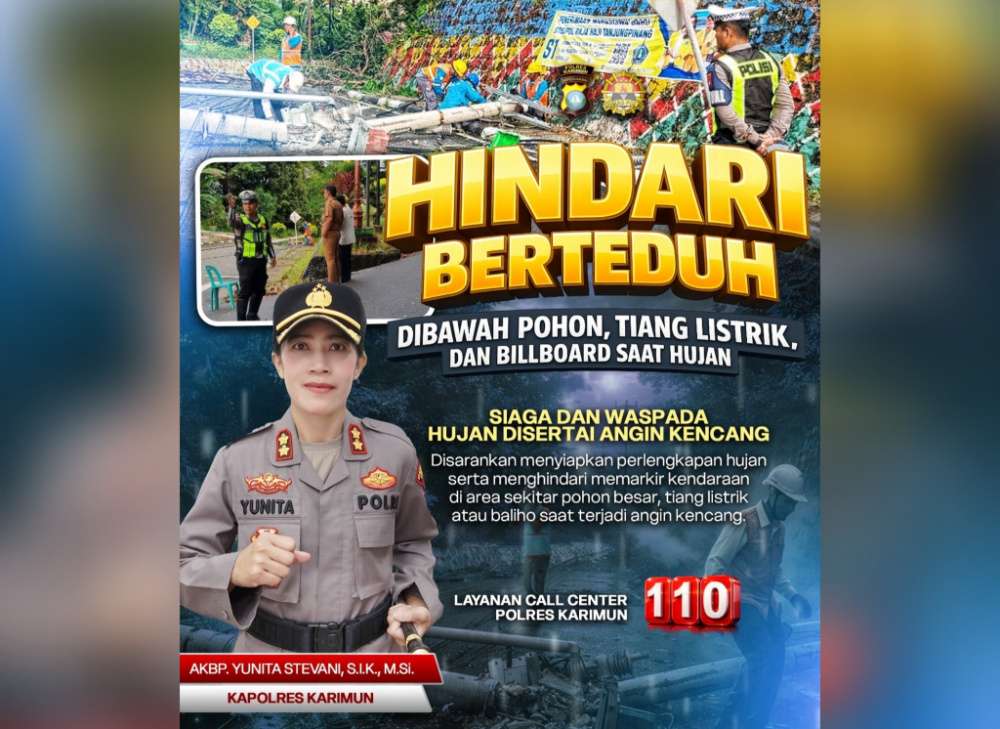 Kapolres Karimun, AKBP Yunita Stevani, S.I.K., M.Si mengingatkan agar masyarakat tidak berteduh di bawah pohon besar, tiang listrik, maupun papan reklame (billboard) karena berisiko tinggi mengalami kecelakaan akibat tumbang atau tersambar petir.