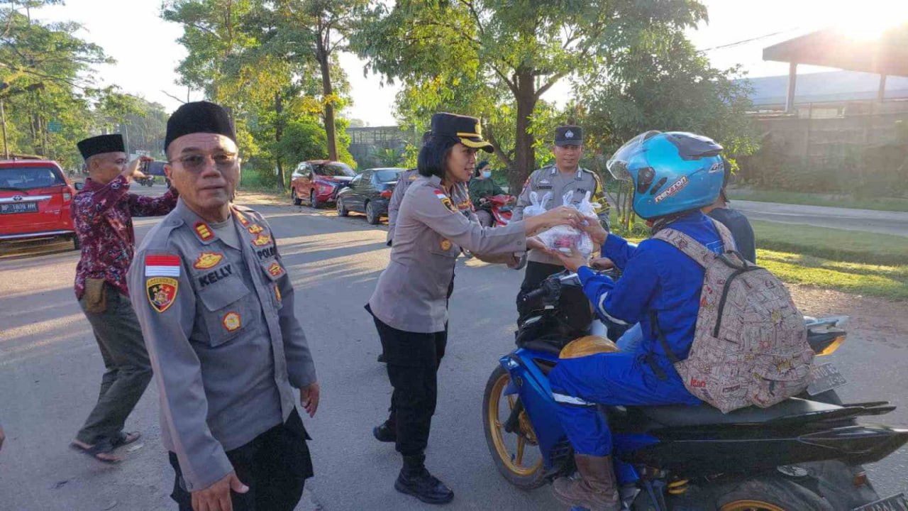 Kapolsek Batu Aji beserta personil dan Bhayangkari, kompak membagikan takjil dengan senyuman penuh kebahagiaan.