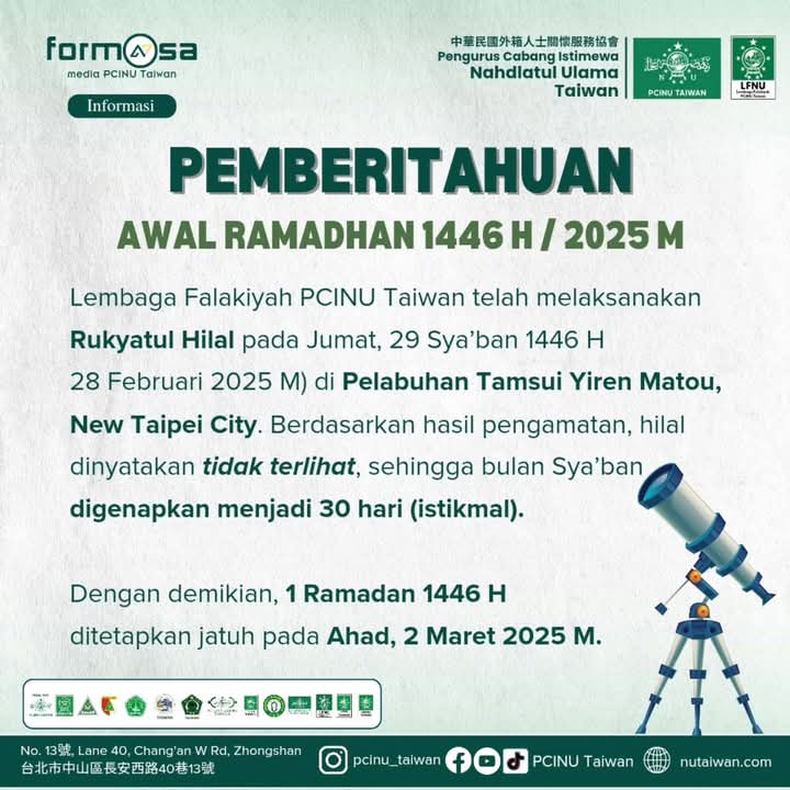 TimesAsiaNews.com | Kaohsiung, Taiwan – Menyambut bulan suci Ramadhan 2025, umat Islam di Taiwan bersiap menjalani ibadah puasa, dan berdasarkan perkiraan, awal puasa di negara ini akan bertepatan dengan 1 atau 2 Maret 2025, mengikuti kalender Islam global.