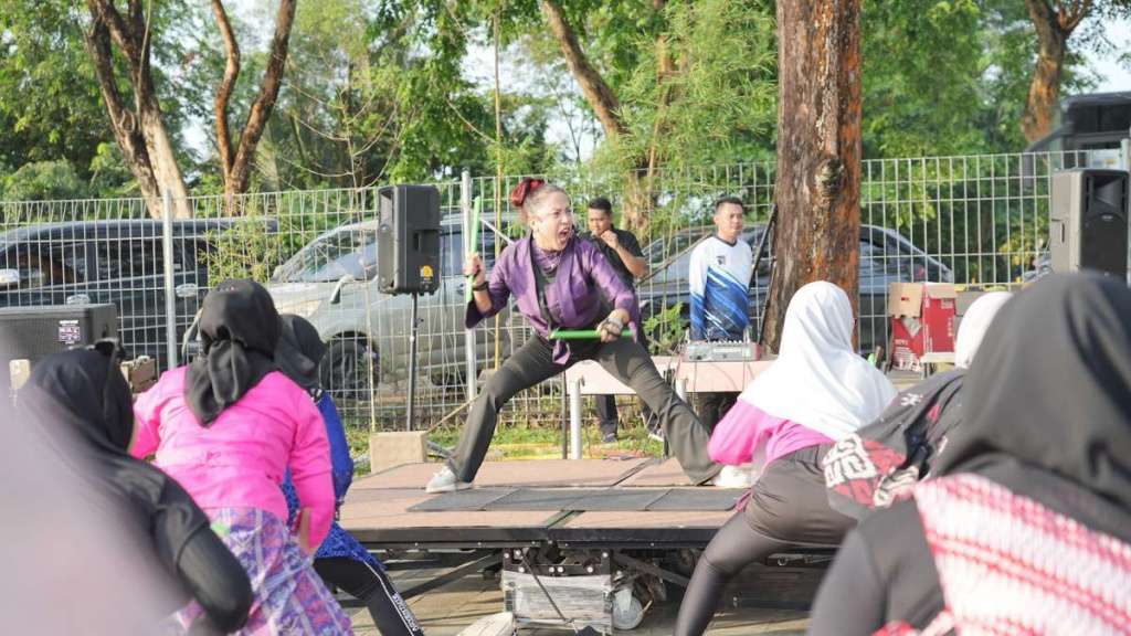 Dipandu oleh Pro Ellysa Minda, lebih dari 100 peserta kompak mengikuti gerakan demi gerakan aerobik sembari mengayunkan ripstix.