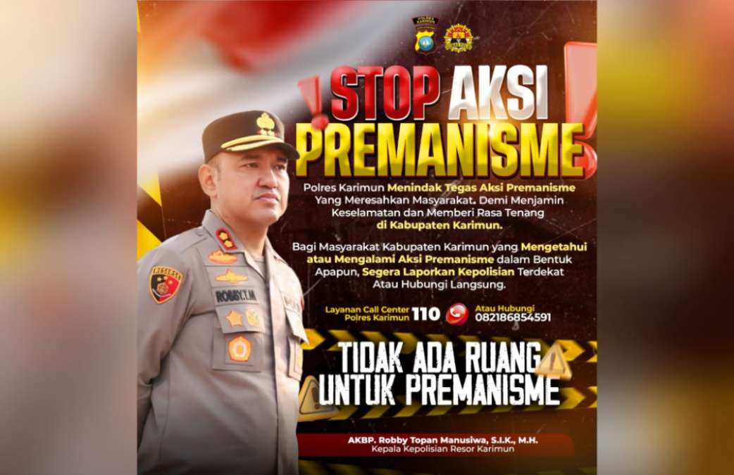 TimesAsiaNews.com | Karimun, Kepulauan Riau – Kapolres Karimun AKBP Robby Topan Manusiwa. S.I.K., M.H., menegaskan bahwa pihaknya menolak segala bentuk premanisme, terutama yang berkedok organisasi masyarakat (ormas). Ia memastikan akan menindak tegas setiap aksi pemerasan dan pungutan liar yang merugikan masyarakat.